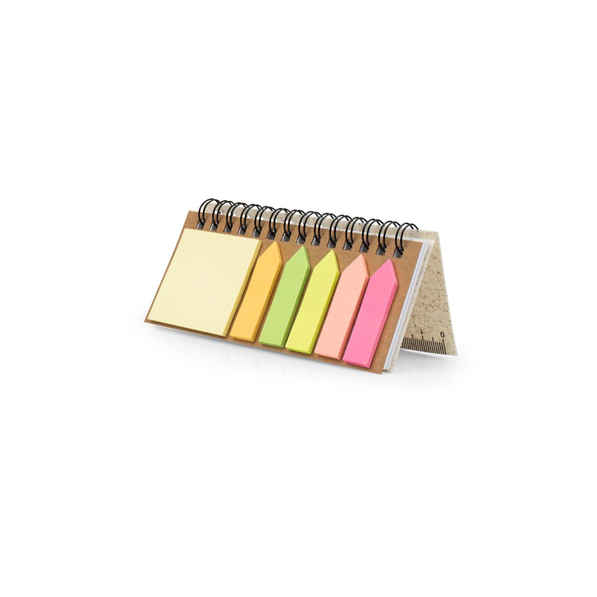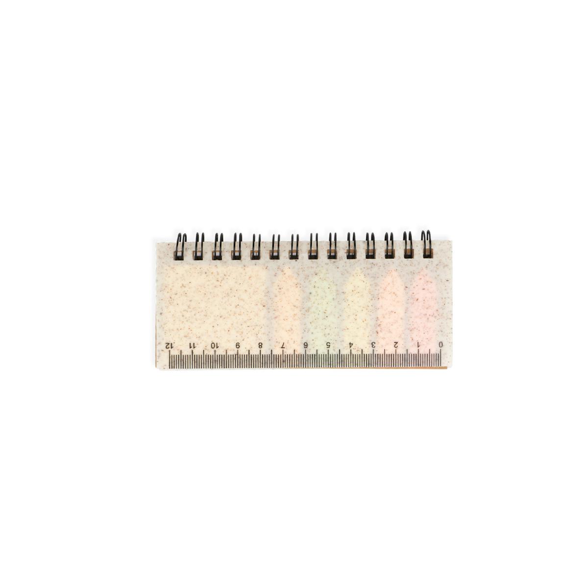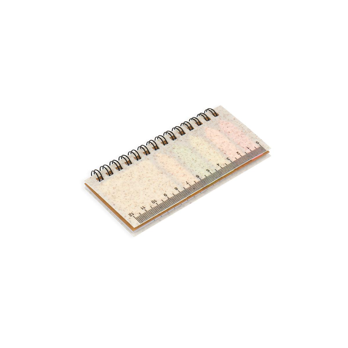 Set de memos con argollado “doble O” cubierta en paja de trigo. Incluye taco de 40 hojas rayadas y 5 juegos de banderas adhesivas en papel de colores de 25 hojas c/u. Regla de 12 centimetros en la tapa.